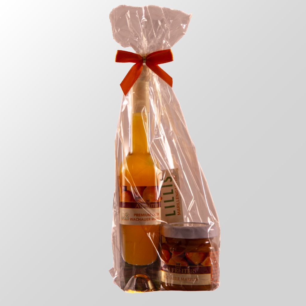 Eine Flasche Marillen Premium Likör 0,04L und ein Glas Marillen Marmelade 50g